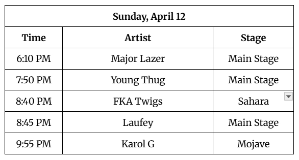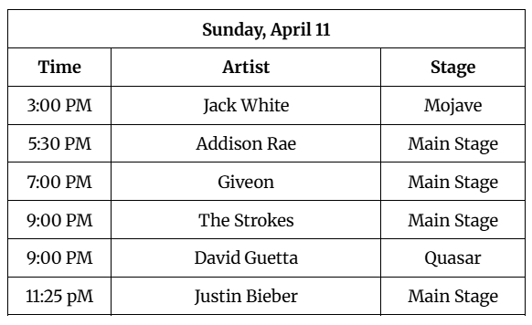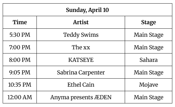 For every single act and every stage time in the complete Coachella schedule, head to coachella.com where everything is laid out perfectly.