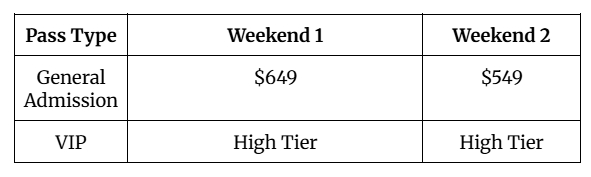 Coachella 2026 tickets sold out in less than a week after the lineup was announced in September 2025. Here is a quick breakdown of what the original prices looked like: